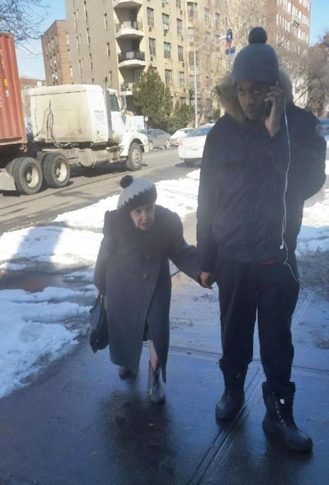 In this photo, Carl Manley was approached by an elderly woman, who needed help being walked home because she was afraid she was going to slip and fall on the ice. Now, Manley does this practically all the time and the two have become close friends.